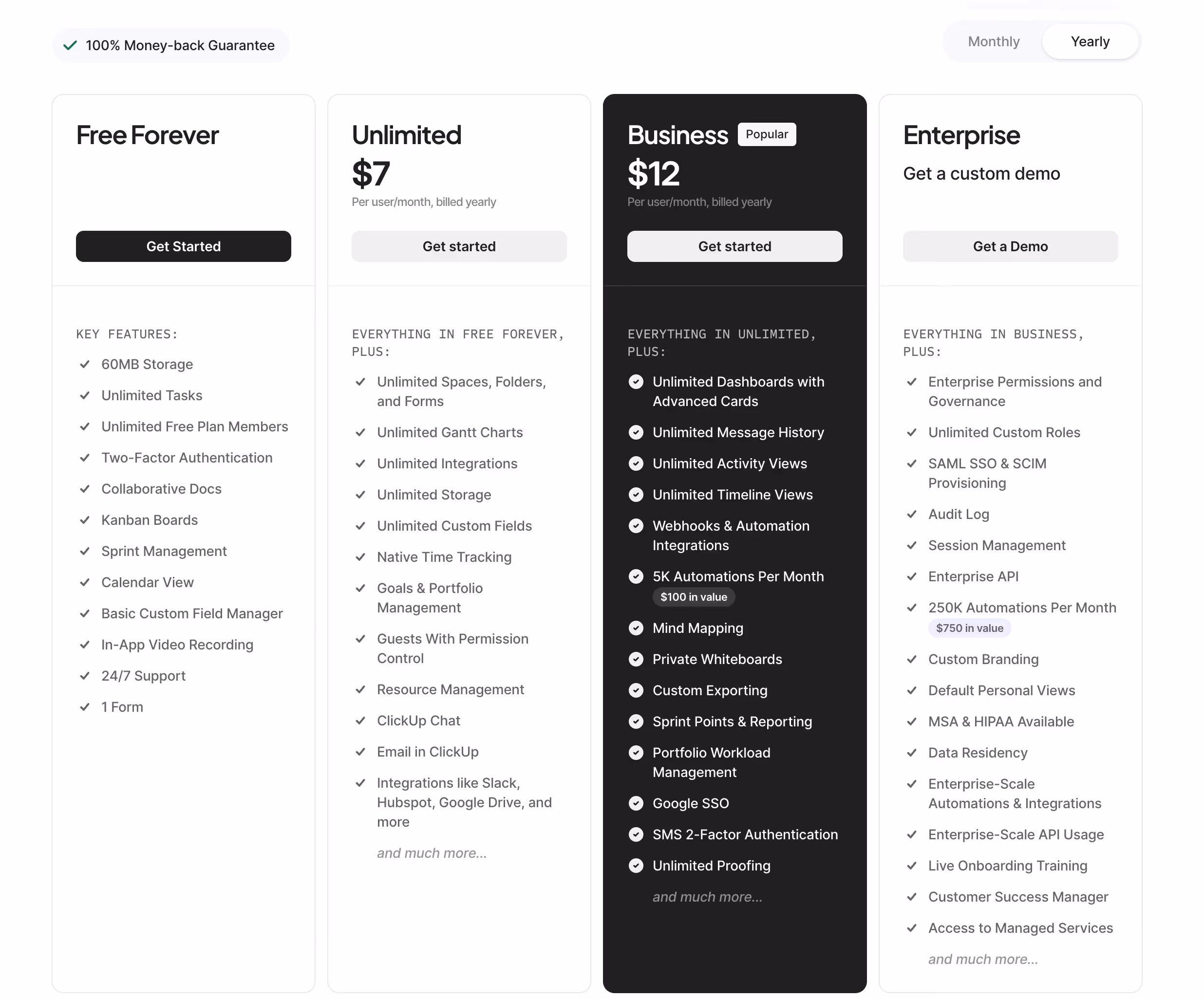 - Business plan ($12/user/month): advanced automations, workload management, advanced reporting options, and unlimited sub-tasks.